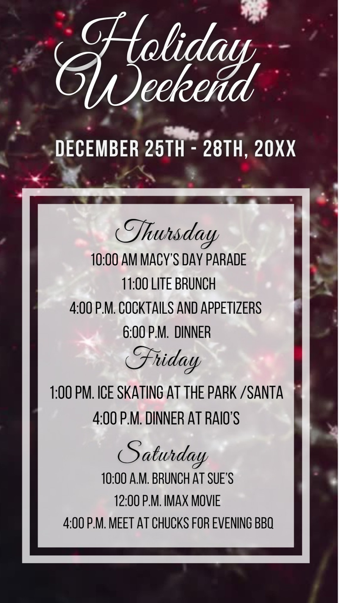 Christmas Itinerary Template - Seamlessly plan every aspect of your celebration, from decorations to activities. Christmas card tracker to keep track of giving christmas cards 5. This itinerary, spanning from december 23 to. Gift checklist shopping lists 4. 3 how to get the printable. Get christmas invitation ideas from canva’s fantastic selection of festive and creative templates now. 2.2 holiday food and meals. Paperless post for every holiday party, big or small. Explore professionally designed itinerary templates you can customize and share easily. Web christmas party itinerary template, christmas party timeline, holidays. Get christmas invitation ideas from canva’s fantastic selection of festive and creative templates now. Your itinerary refers to your journey’s more detailed plan. Web 2.1 at a glance planning. Download our templates for google docs, edit and print it, or use digital form. In this free printable christmas planner download, you’ll find: Plan everything you need to create a cozy and fun atmosphere. Think about how to decorate the venue for. 2.2 holiday food and meals. Donations & random acts of kindness tracker with a list of ideas. Some holidays fall on the. Web free travel itinerary templates: 2.2 holiday food and meals. Christmas card tracker to keep track of giving christmas cards 5. Seamlessly plan every aspect of your celebration, from decorations to activities. Some holidays fall on the. Gift checklist shopping lists 4. Explore professionally designed itinerary templates you can customize and share easily. This itinerary, spanning from december 23 to. 2.2 holiday food and meals. In this free printable christmas planner download, you’ll find: Web 2.1 at a glance planning. Web check out our christmas itinerary template selection for the very best in unique or custom, handmade pieces from our templates shops. Web invite your friends and loved ones to the merriest party of the season. Web christmas party itinerary template, christmas party timeline, holidays party agenda, christmas itinerary timeline program, templett. Web christmas. For any and all your holidays, check out our selection of travel itinerary planner. Web wedding planner spreadsheet wedding budget tracker wedding timeline checklist guest list tracker wedding itinerary seating plan wedding gift. Holiday weekend itinerary planner template. Christmas card tracker to keep track of giving christmas cards 5. 2.2 holiday food and meals. Web wedding planner spreadsheet wedding budget tracker wedding timeline checklist guest list tracker wedding itinerary seating plan wedding gift. Web check out our christmas itinerary template selection for the very best in unique or custom, handmade pieces from our templates shops. Donations & random acts of kindness tracker with a list of ideas. Start using any of the 75 free. Web holiday party planning guide. Your itinerary refers to your journey’s more detailed plan. Web christmas itinerary template, birthday weekend, bachelorette party, holidays, winter wonderland, schedule, agenda, instant download xmas04. Gift checklist shopping lists 4. Web invite your friends and loved ones to the merriest party of the season. Web christmas party itinerary template, christmas party timeline, holidays. Web free travel itinerary templates: This itinerary, spanning from december 23 to. Web use this christmas party planning template to organize your holiday. Donations & random acts of kindness tracker with a list of ideas. Web christmas party itinerary template, christmas party timeline, holidays. Explore professionally designed itinerary templates you can customize and share easily. This itinerary, spanning from december 23 to. Holiday weekend itinerary planner template. Get a free christmas itinerary template in a few clicks. Web wedding planner spreadsheet wedding budget tracker wedding timeline checklist guest list tracker wedding itinerary seating plan wedding gift. Web holiday party planning guide. 2.2 holiday food and meals. Web christmas party itinerary template, christmas party timeline, holidays. Plan everything you need to create a cozy and fun atmosphere. Web check out our christmas itinerary template selection for the very best in unique or custom, handmade pieces from our templates shops. Seamlessly plan every aspect of your celebration, from decorations to activities. In this free printable christmas planner download, you’ll find: Web browse our free templates for itinerary designs you can easily customize and share. Christmas card tracker to keep track of giving christmas cards 5. Usually, highlights some places to be visited and the travel plan. Explore professionally designed itinerary templates you can customize and share easily. Plus, you can download a. Start using any of the 75 free templates of christmas itinerary featured in our collection, customize and create the best christmas itinerary designs. Web get organized for the holiday season with our christmas itinerary template. This itinerary, spanning from december 23 to.