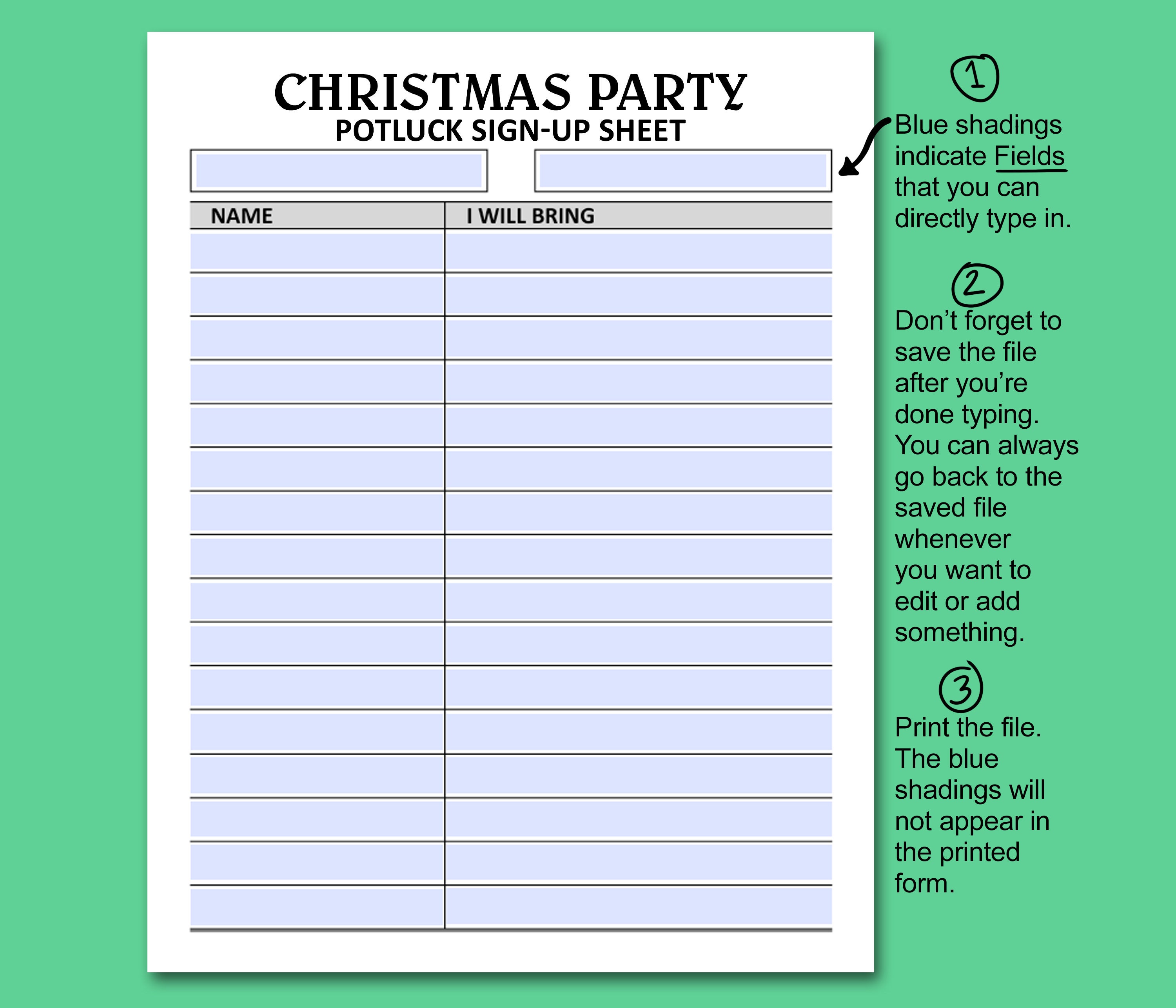 Christmas Potluck Sign up Sheet Printable Fillable PDF, Holiday Potluck