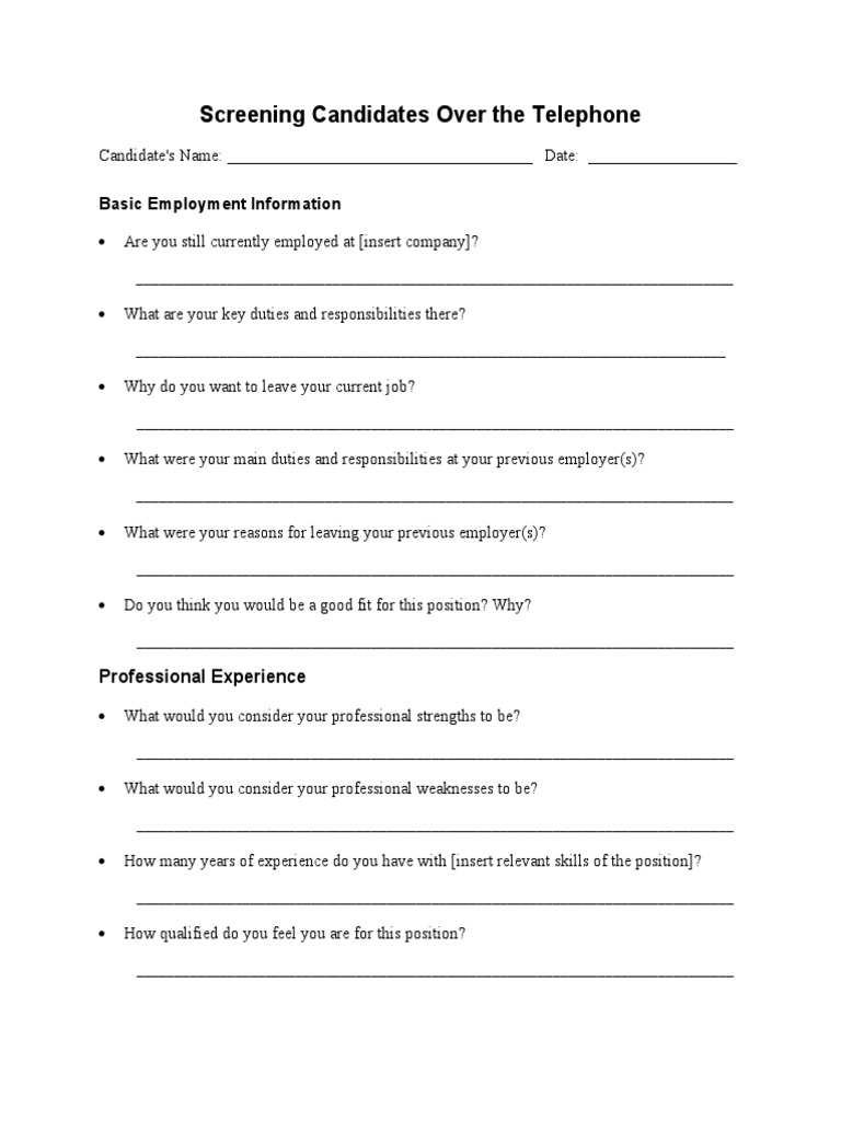 Telephone Screening Template - Web use a telephone screen template (ms word) to screen candidates. Telephone screening applicants can save you time. These phone screening questions are intended to break the ice and get the conversation going with your candidate. Web a simple way to format your answer is: Following up on the phone call. You may also develop your own template using interviewing and technical questions. Web what is a phone screen? A positive phone screen can. Web phone screening interview questions are valuable for assessing an applicant’s potential alignment. A phone screen interview is a preliminary interview used to quickly gauge whether a candidate could be right for the position. Web what is a phone screening interview? Simply put, a phone screening interview is the interview before the interview. This is a phone interview email template to use during your hiring process. Web what is a phone screen? A positive phone screen can. Simply put, a phone screening interview is the interview before the interview. Web phone screening interview questions are valuable for assessing an applicant’s potential alignment. Web a phone screen call, often referred to as a phone screen or phone screening, is an initial interview or conversation conducted over the phone as part of the. Web 7 min read. Web what. Web 7 min read. This is a phone interview email template to use during your hiring process. A phone screen interview is a preliminary interview used to quickly gauge whether a candidate could be right for the position. Web phone screen interview template. The first phone interview is quick and serves to let you know a little more about the. Are you using phone screening as part of your interviewing process? A phone screen interview is a preliminary interview used to quickly gauge whether a candidate could be right for the position. Web what is a phone screening interview? Access 350+ customizable job descriptions wizehire. Tell me about yourself/tell me about your background. Web introductory phone screening questions. Web level up your phone interviewing technique with this phone screen question template. How to make a phone screen interview worthwhile. Web phone screen interview template. Web 10 best phone interview screening questions. Web phone screen interview template. Web what is a phone screening interview? Web 5 min read. You can use this template to help you screen applicants before you decide who to interview. Web a phone screen call, often referred to as a phone screen or phone screening, is an initial interview or conversation conducted over the phone as part of. Web what is a phone screen? You may also develop your own template using interviewing and technical questions. The first phone interview is quick and serves to let you know a little more about the potential candidates before the true interviewing process. How to make a phone screen interview worthwhile. Telephone screening applicants can save you time. Get started with this template (free!) Web use a telephone screen template (ms word) to screen candidates. Web level up your phone interviewing technique with this phone screen question template. These phone screening questions are intended to break the ice and get the conversation going with your candidate. Web phone screening interview questions are valuable for assessing an applicant’s potential. Telephone screening applicants can save you time. Web introductory phone screening questions. Standard phone screen questions for hiring managers, hr, and recruiters. This is a guest post from our friends at kayako. Web phone screening interview questions are valuable for assessing an applicant’s potential alignment. You may also develop your own template using interviewing and technical questions. Standard phone screen questions for hiring managers, hr, and recruiters. Web phone screening interview questions are valuable for assessing an applicant’s potential alignment. This is a guest post from our friends at kayako. Web 5 min read. You may also develop your own template using interviewing and technical questions. Web introductory phone screening questions. This is a guest post from our friends at kayako. To make a phone screen interview worthwhile, prepare by determining what really matters for the. You can use this template to help you screen applicants before you decide who to interview. Talk about what you’re doing now, with an emphasis on how it relates to the job you’re interviewing for. Web 10 best phone interview screening questions. Web 7 min read. Are you using phone screening as part of your interviewing process? Telephone screening applicants can save you time. A phone screen interview is a preliminary interview used to quickly gauge whether a candidate could be right for the position. How to make a phone screen interview worthwhile. Being prepared helps recruiters be as efficient as possible during the short amount of time spent during an interview screen. Plus, learn phone interview conduct tips and discover candidate red flags. Recruiters and hiring managers will likely start a phone interview by asking about your background. In this initial screening interview, a recruiter (or someone.